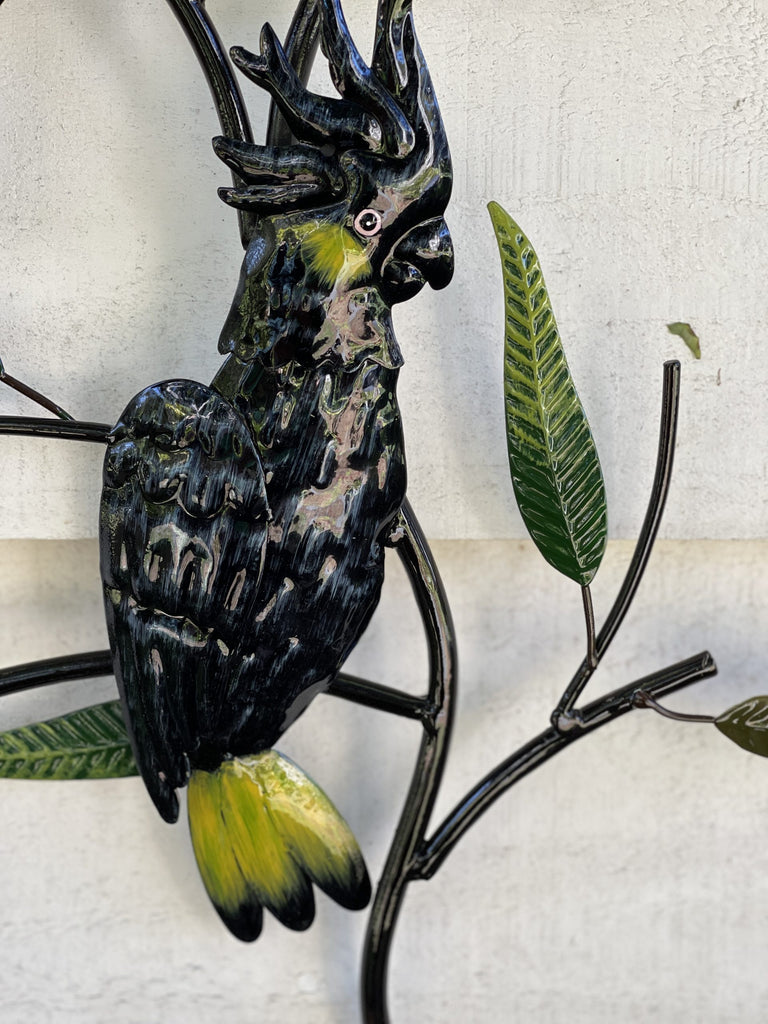 Metal tree with three black and yellow cockatoos perched on the branches. Hand-painted and lacquered with a hanging ring on the back.
