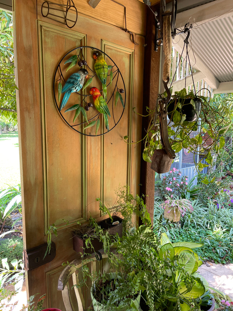 Metal brightly coloured parrots encased in a circle on a branch with gumnuts. Beautiful on any wall. Hand-painted and lacquered with a hanging ring on the back.