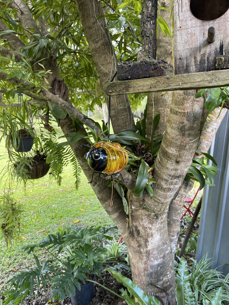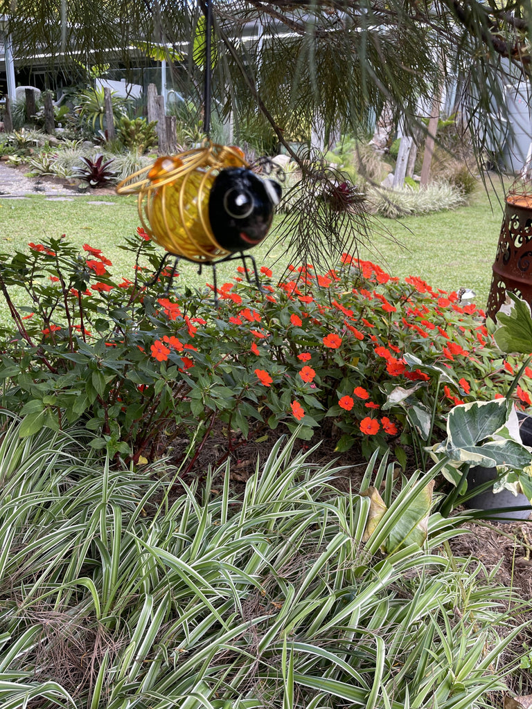 Solar bee with stretchy spring cord, perfect to hang in the garden. Body lights up.